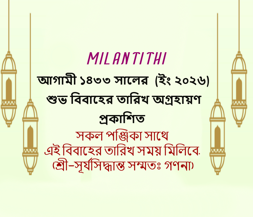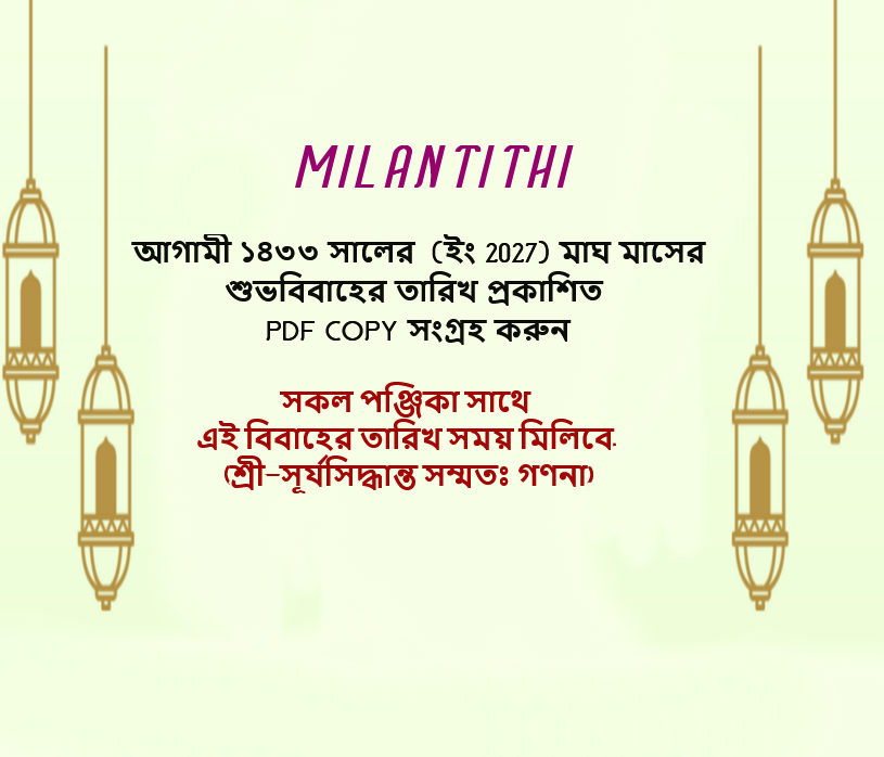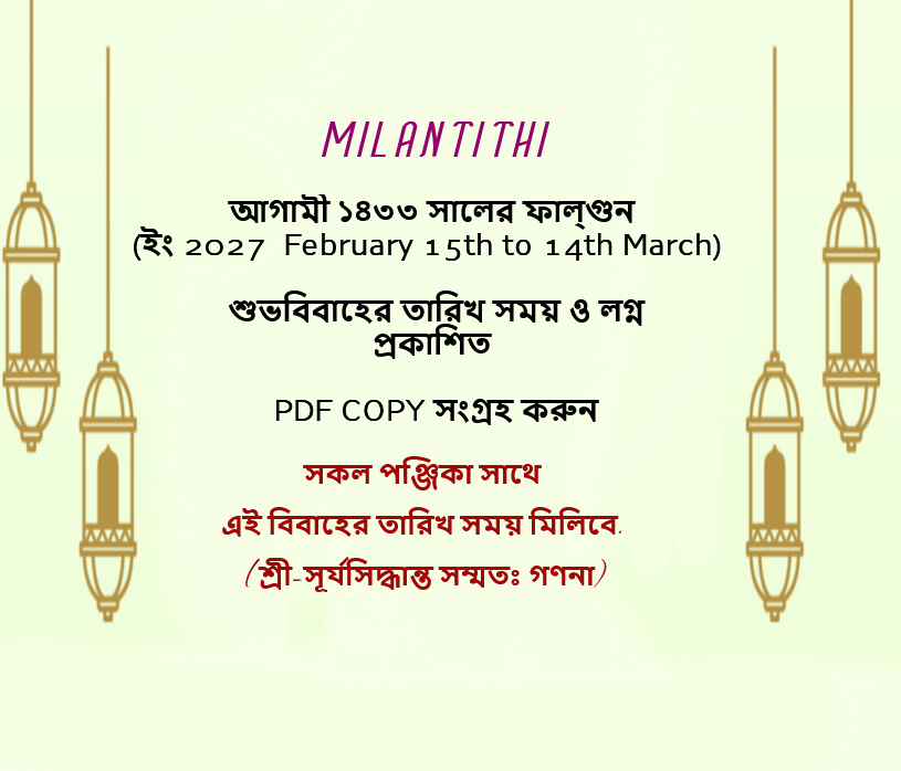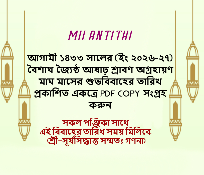 ১৪৩৩ সালের (2026-27) জন্য শুভবিবাহের তারিখ, তালিকা এখন পিডিএফ ফরম্যাটে উপলব্ধ, এখনই কিনুন। আপনার চাহিদা পূরণের জন্য শুভবিবাহের তারিখ সম্পর্কে আমাদের কাছ থেকে আপনি শীঘ্রই বিস্তারিত তথ্য পাবেন, বাংলা ১৪৩৩ সালের সাথে সম্পর্কিত ইংরেজি ২০২৬-২৭ সালের বিবাহের তারিখ সময় লগ্ন প্রকাশিত.